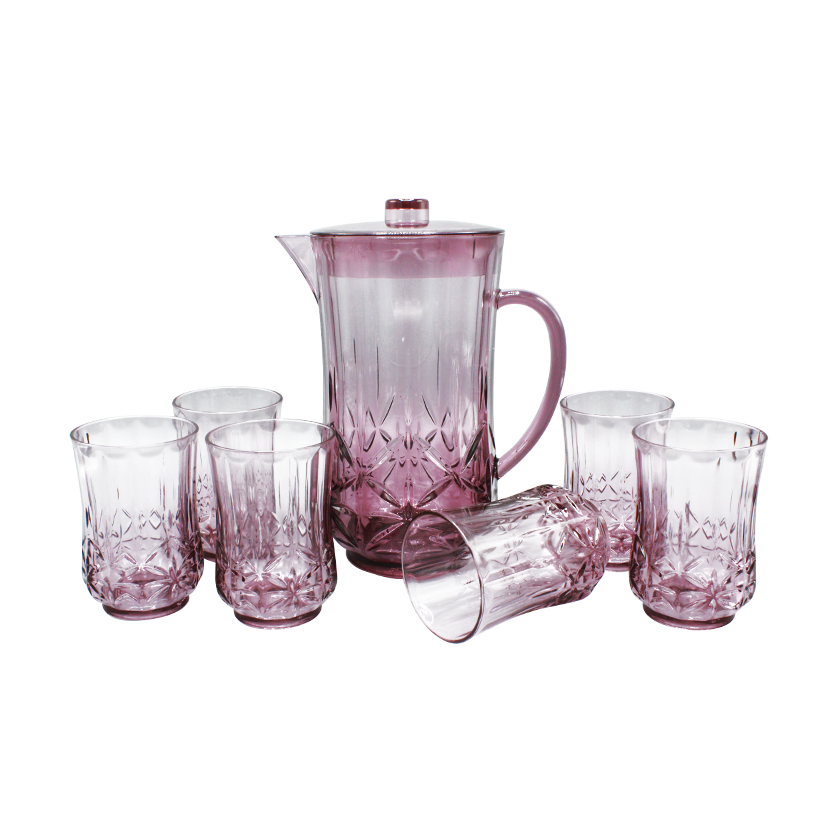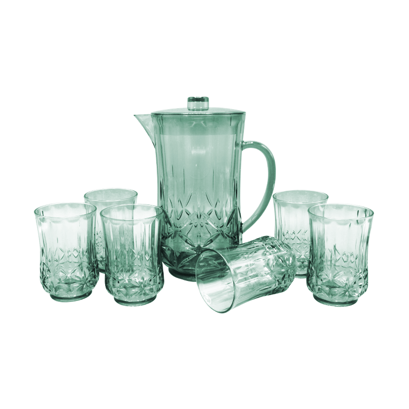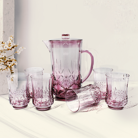 Add a touch of elegance with the traditional cut pattern and crystal-clear Serene Acrylic Water Set. The set consists of an acrylic jug of 1.3 Litres and six glasses of 300 mL each, making it an ideal choice for gifting and serving beverages. Made from crack-resistant and shatterproof acrylic, it ensures durability and a high-quality product with a clear surface like glass. The Serene Water Set is made of food-grade and BPA-free material that is suitable for holding drinks.