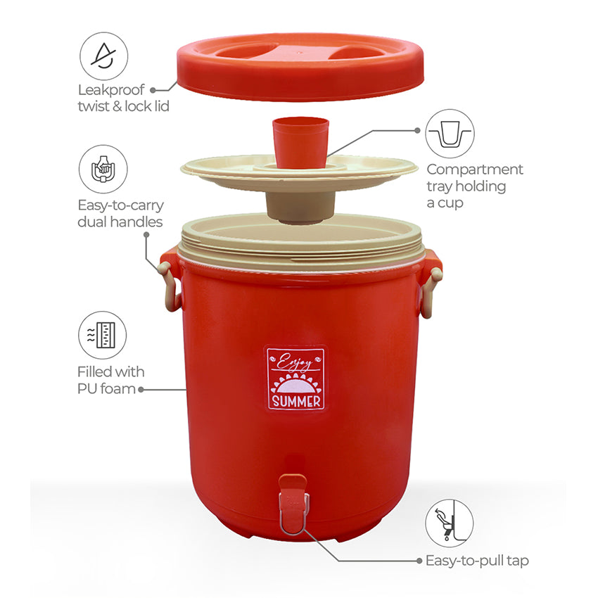 Dive into the vibrant hues of summer with the Magnum Cooler, your ultimate companion for enjoying refreshing beverages in style! With a great capacity of 22 Liter and insulated with PU foam, it keeps beverages cool for 4 to 6 hours. Its sturdy dual handles allows you to carry your favorite drink wherever your adventures lead. Pull the tap, pour the drink into the cup and sip on cool drinks to stay hydrated throughout your outdoor activities and picnics.. Made from BPA-free and food-grade material, ensuring it is safe for all your beverages.