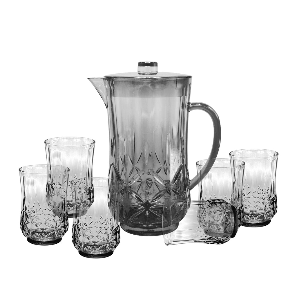 Add a touch of elegance with the traditional cut pattern and crystal-clear Serene Acrylic Water Set. The set consists of an acrylic jug of 1.3 Litres and six glasses of 300 mL each, making it an ideal choice for gifting and serving beverages. Made from crack-resistant and shatterproof acrylic, it ensures durability and a high-quality product with a clear surface like glass. The Serene Water Set is made of food-grade and BPA-free material that is suitable for holding drinks.