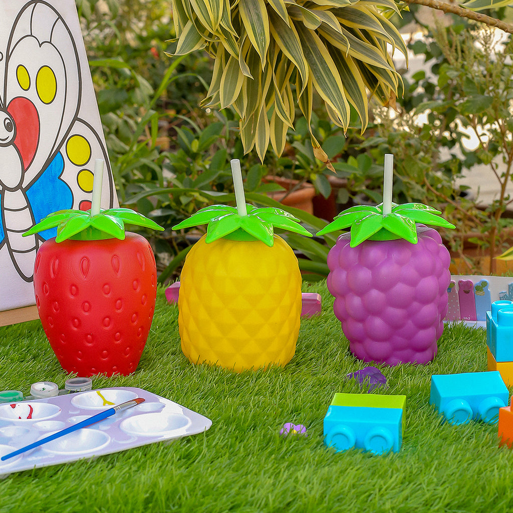 Add a splash of fun to your drinks with these fruit-inspired straw tumblers, designed to resemble pineapples, grapes, and strawberries. Perfect for parties, picnics, or everyday use, these lightweight and durable tumblers come with reusable straws for easy sipping. The secure screw-on lids prevent spills, making them great for on-the-go beverages. Serve your favorite juices, smoothies, or chilled drinks with these vibrant and playful tumblers!